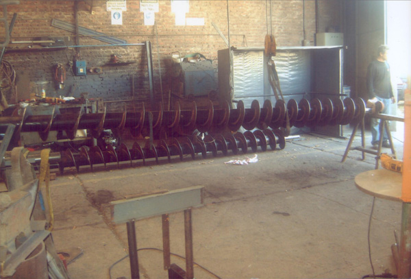 Diámetro 300 mm, longitud 4500 mm, eje SAE 1045 y espiras en Hardox 8 mm.